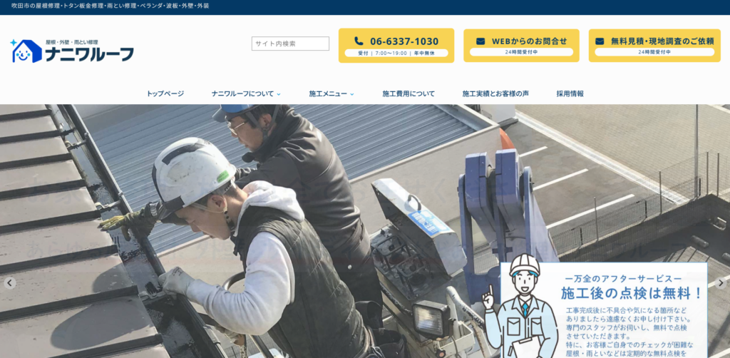 ナニワルーフは、吹田市や豊中市を中心に20年以上、2,500棟以上の施工実績を持つ屋根・外壁修繕の専門店です。また、お客様に寄り添った「親切・丁寧」な対応や施工後の「無料10年保証」や、専門スタッフによる「定期的な無料点検サービス」が用意されており、長期的な安心が確保されています。