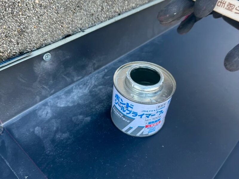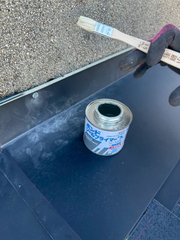 雨押え板金の上部にはコーキングで水が入らないようにしますが、コーキングの付きがさらによくなるようにプライマーを塗っていきます。