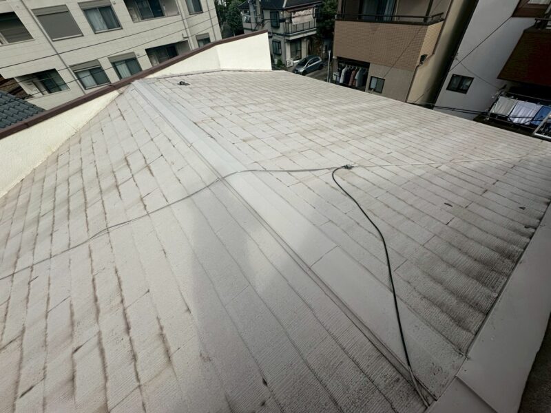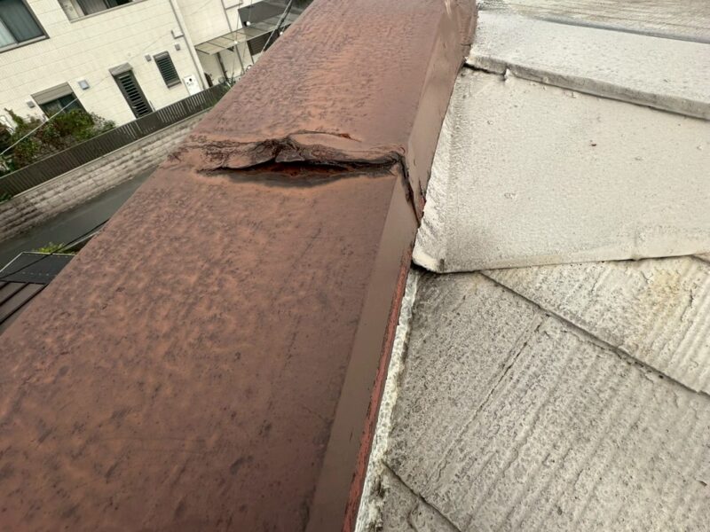 室内から雨漏り箇所のおおよその位置を確認し、屋根に上がって詳しく調査したところ、スレート屋根の割れや笠木の劣化など、屋根全体に経年劣化が見受けられました。