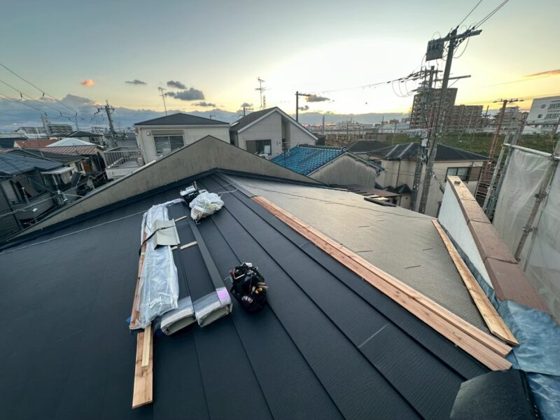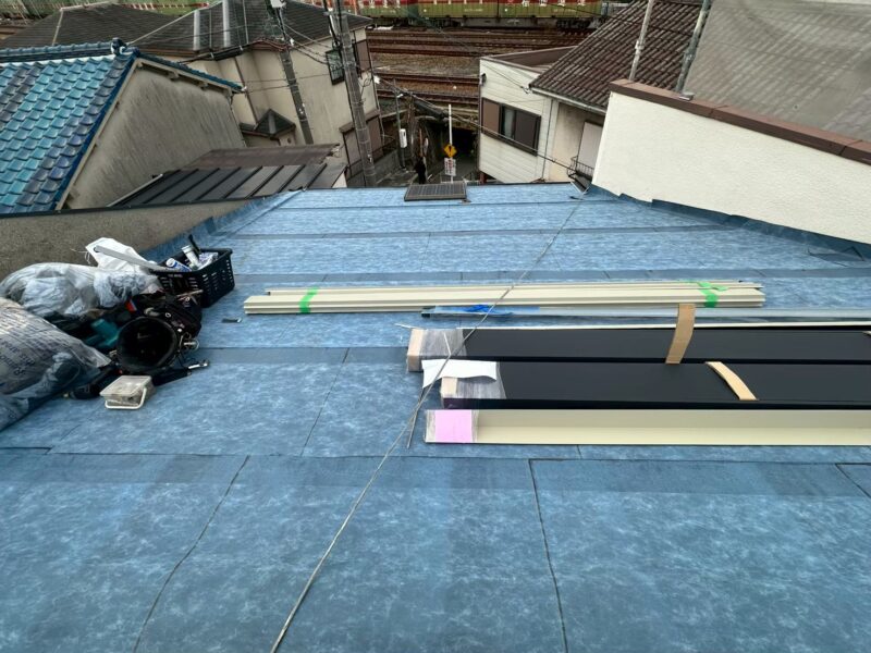 既存屋根材の上からルーフィング(防水紙)を貼っていきます。防水紙は雨漏りに対する最後の砦となりますので慎重に貼っていきます。