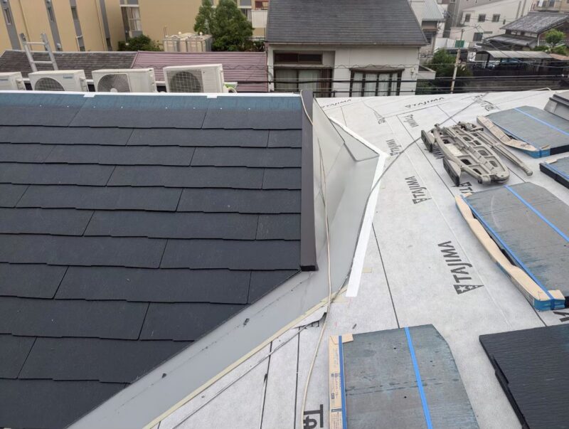 旧瓦部分にカラーベストを施工していきます。また、同時にガルバニウム鋼鈑で谷板金を仕込んでいきます。