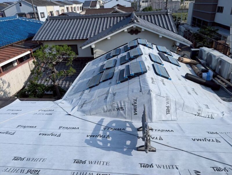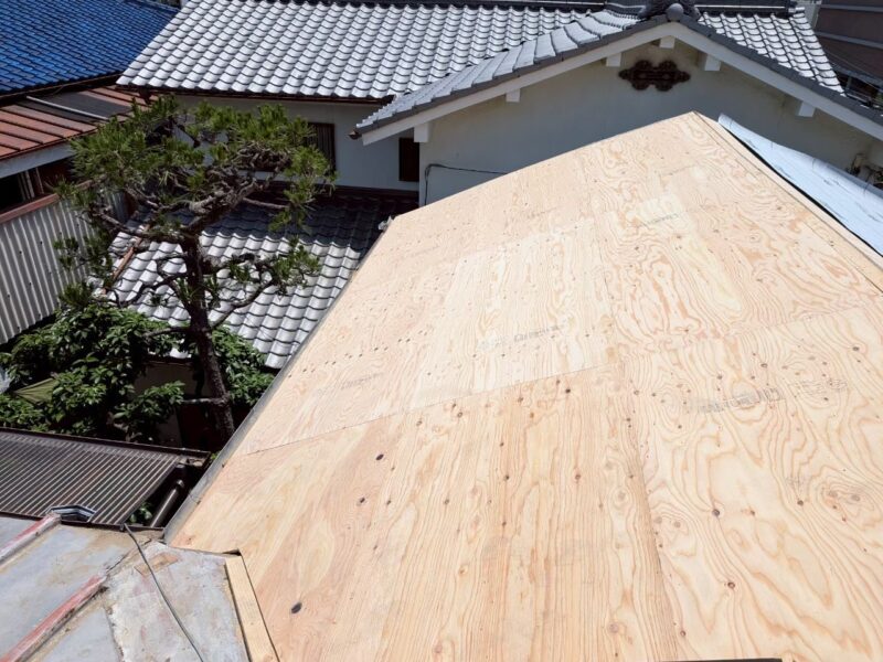コンパネおよび板金部分にルーフィング(防水紙)を貼っていきます。