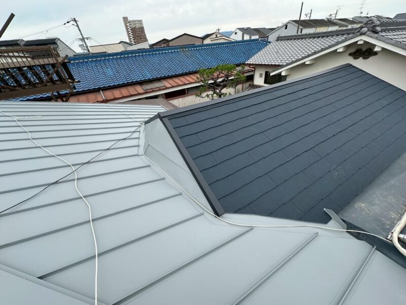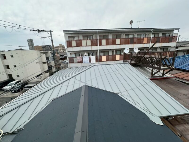 旧金属屋根部分も上からガルバニウム鋼鈑を施工して(カバー工法)完了となります。